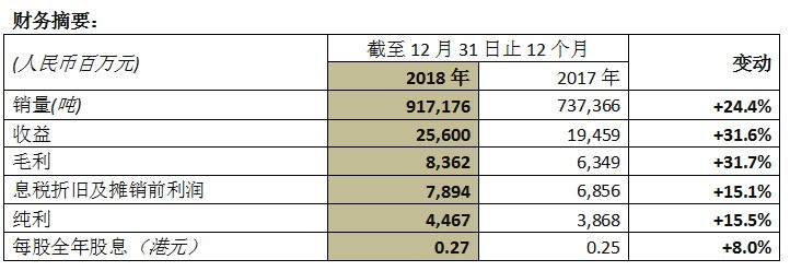 (香港,2019年3月29日) – 全球领先的铝加工产品研发制造商中国巴黎人贵宾会控股有限公司(“中国巴黎人贵宾会”或“公司”,连同其附属公司“集团”;股份代号:01333)公布截至2018年12月31日止年度(“回顾年”)之经审核全年业绩。回顾年内,铝合金模板、轨道车辆大部件等高端产品销售理想,加上铝压延业务的稳定贡献,带动集团整体销量按年增长24.4%至91.7万吨。受益于持续的产品结构优化及附加值提升,总收益按年上升31.6%至人民币256.0亿元。毛利按年增长31.7%至人民币83.6亿元。毛利率为32.7%。纯利按年增长15.5%至人民币44.7亿元。